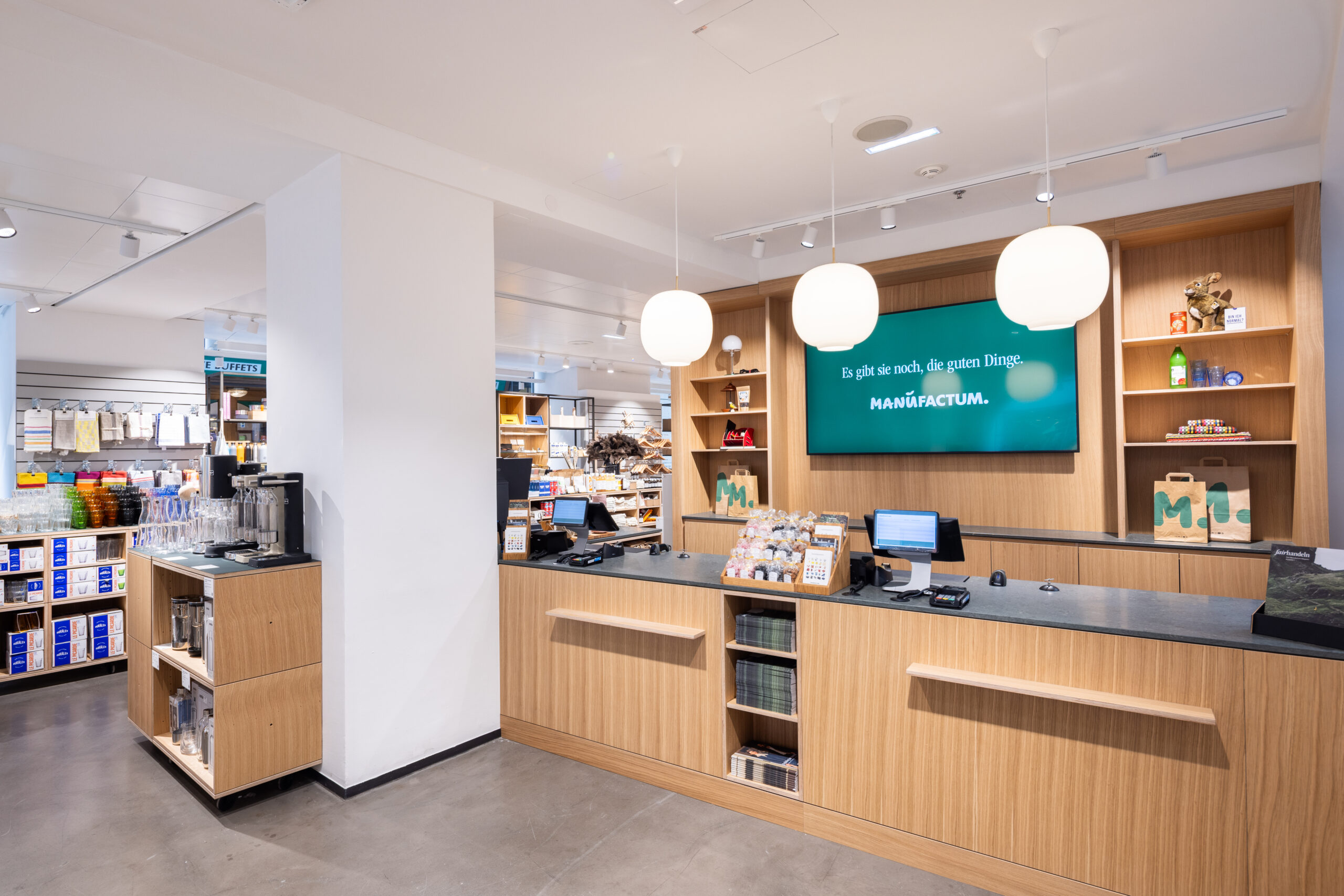 In the new Manufactum store, modular display units made of light oak, combined with dark steel and green linoleum, define the space and create a clear, structured presentation. A track lighting system suspended in the 17-meter-high atrium ensures optimal illumination of the central display units. The coordinated materials and colors create a calm, elegant atmosphere in which the curated selection of high-quality products is showcased to its best advantage.