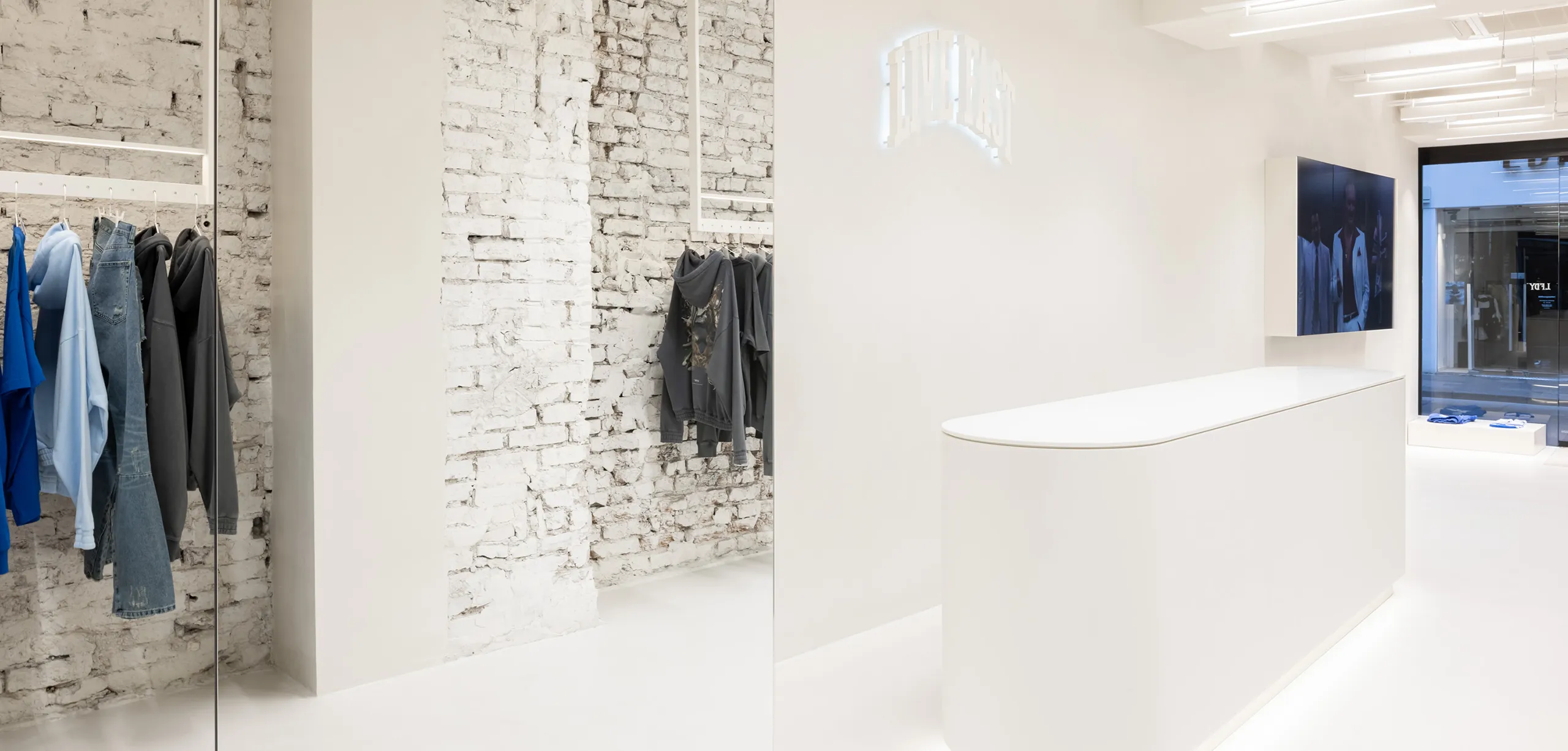 Die Gestaltung des Stores setzt mit einem monochrom warmweißen Look auf Zurückhaltung als Hintergrund für die nach Farben sortierte Ware. Zentral für die Gestaltung waren die teilweise offengelegten rauen Steinwände im Kontrast zu der glatten, hellen Raumhülle.